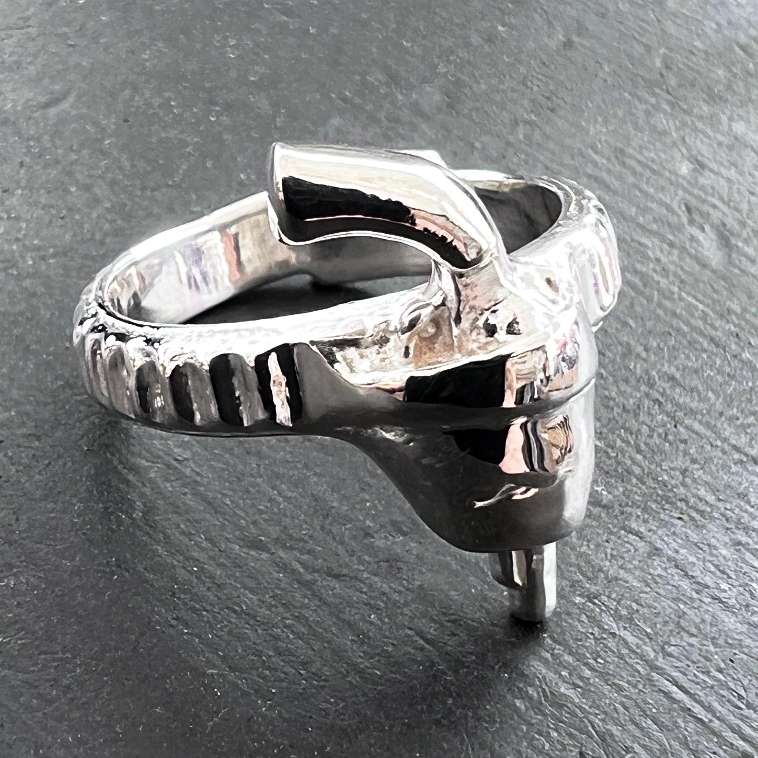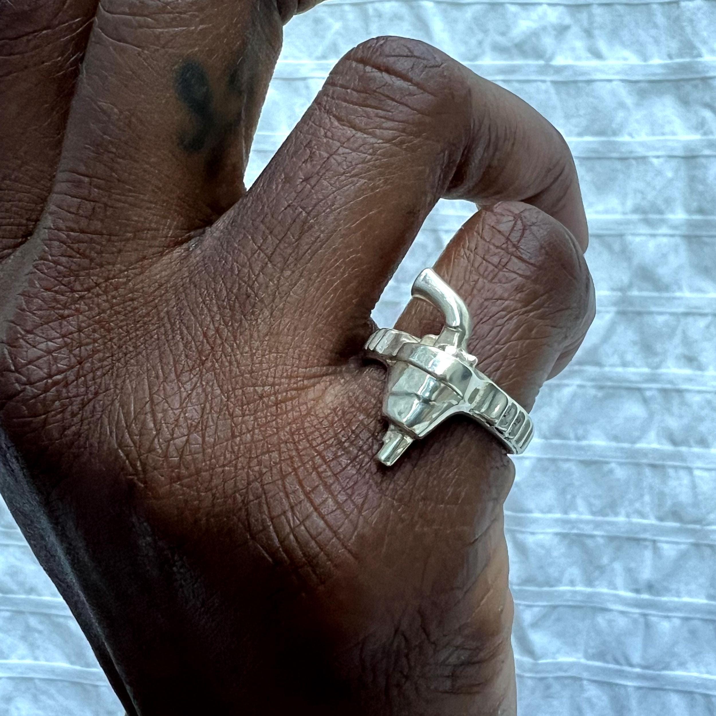 The Pistol Ring is a symbol of peace as it remains forever holstered, but you can still look cool packing heat. Please specify ring size when ordering. Available in cast solid sterling silver or gold vermeil using no nickel.