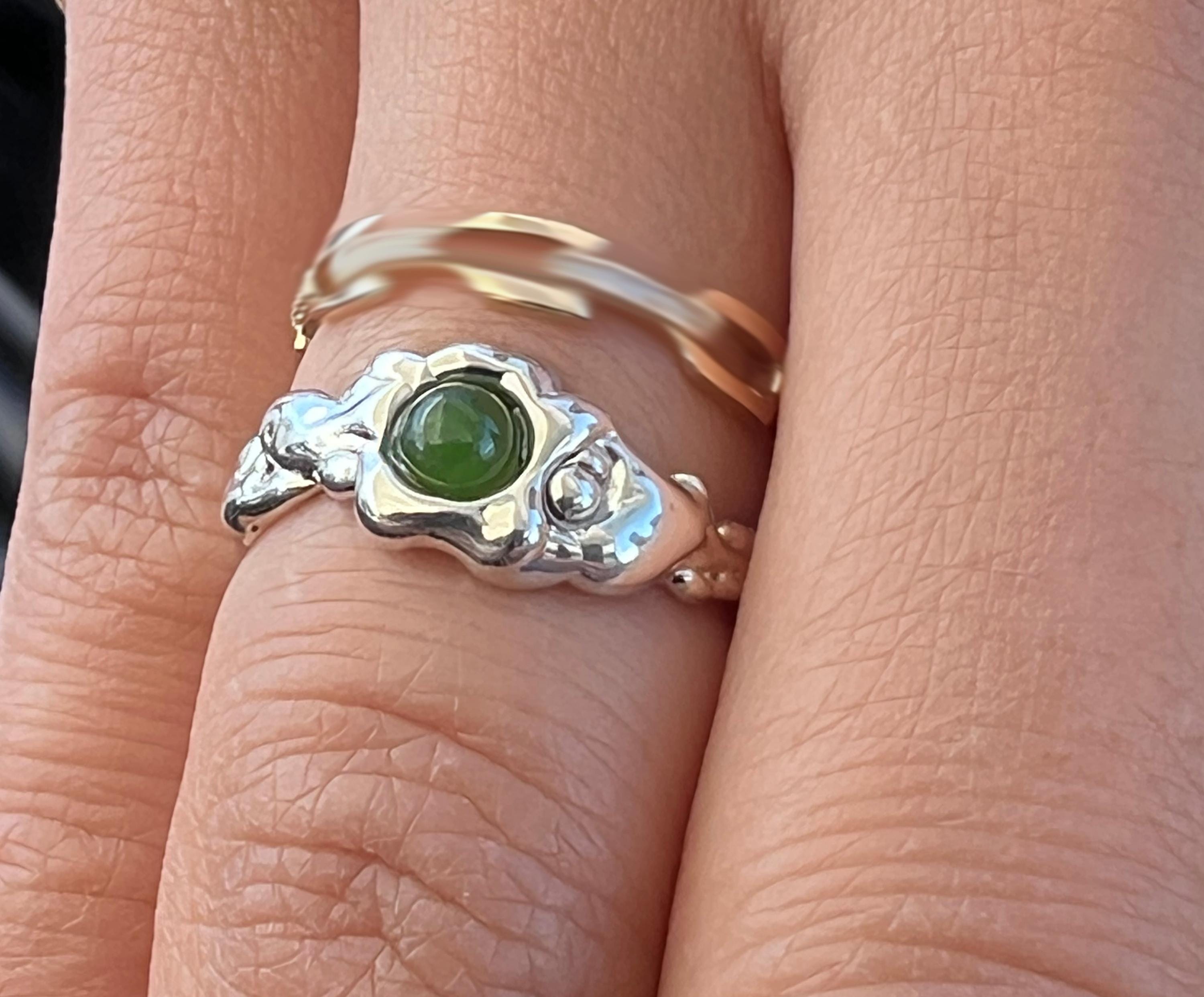 The Thin River ring with Jade is set with a beautiful 4mm cabochon hand selected for it's quality. This new thinner version of one of my most popular designs is handmade so no too are quite alike. The organic undulations of twisted dripping metal will captivate your senses for a lifetime.