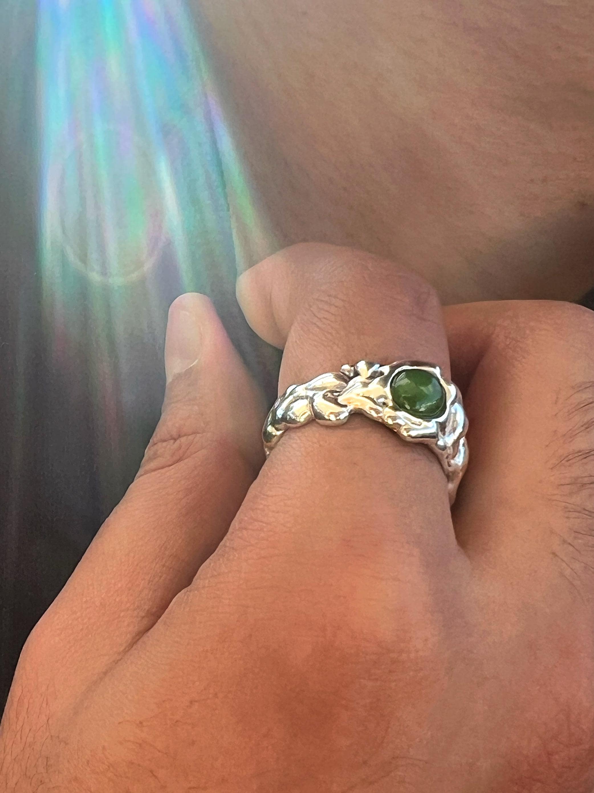 The Wide River Ring set with a beautiful 6mm Jade cabochon is one of my most popular designs and the ring I wear daily. The organic undulations of twisted dripping metal will captivate your senses as it evokes a turbulent river frozen in time.