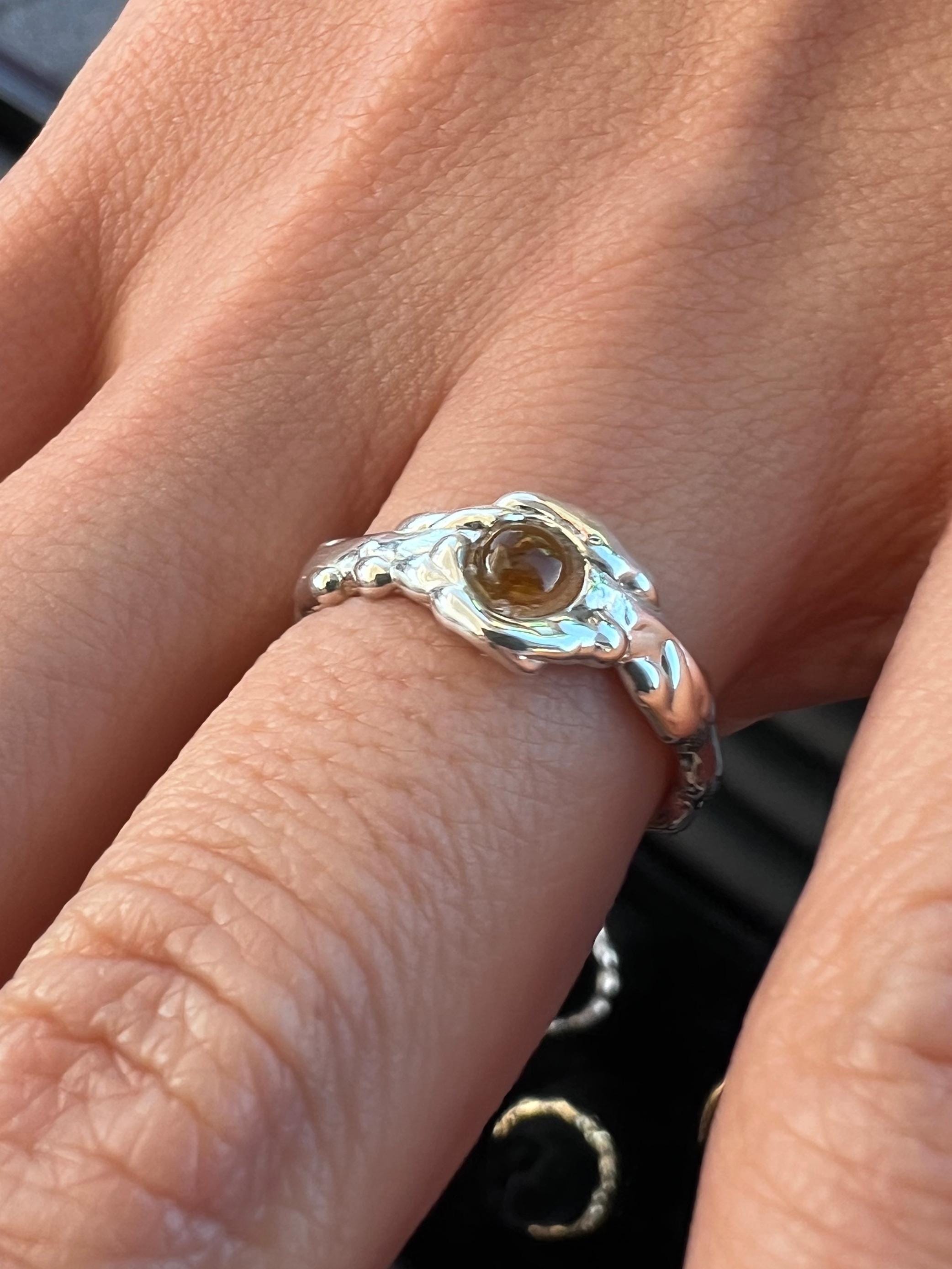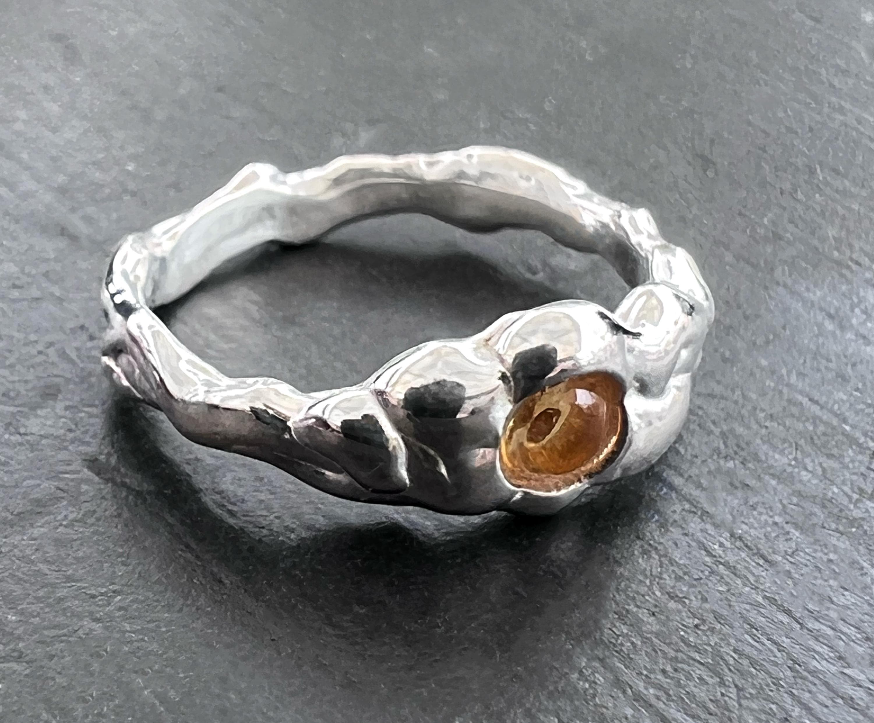 The Thin River ring with golden citrine is set with a beautiful 4mm cabochon hand selected for it's quality. This new thinner version of one of my most popular designs is sure to please. The organic undulations of twisted dripping metal will captivate your senses for a lifetime.