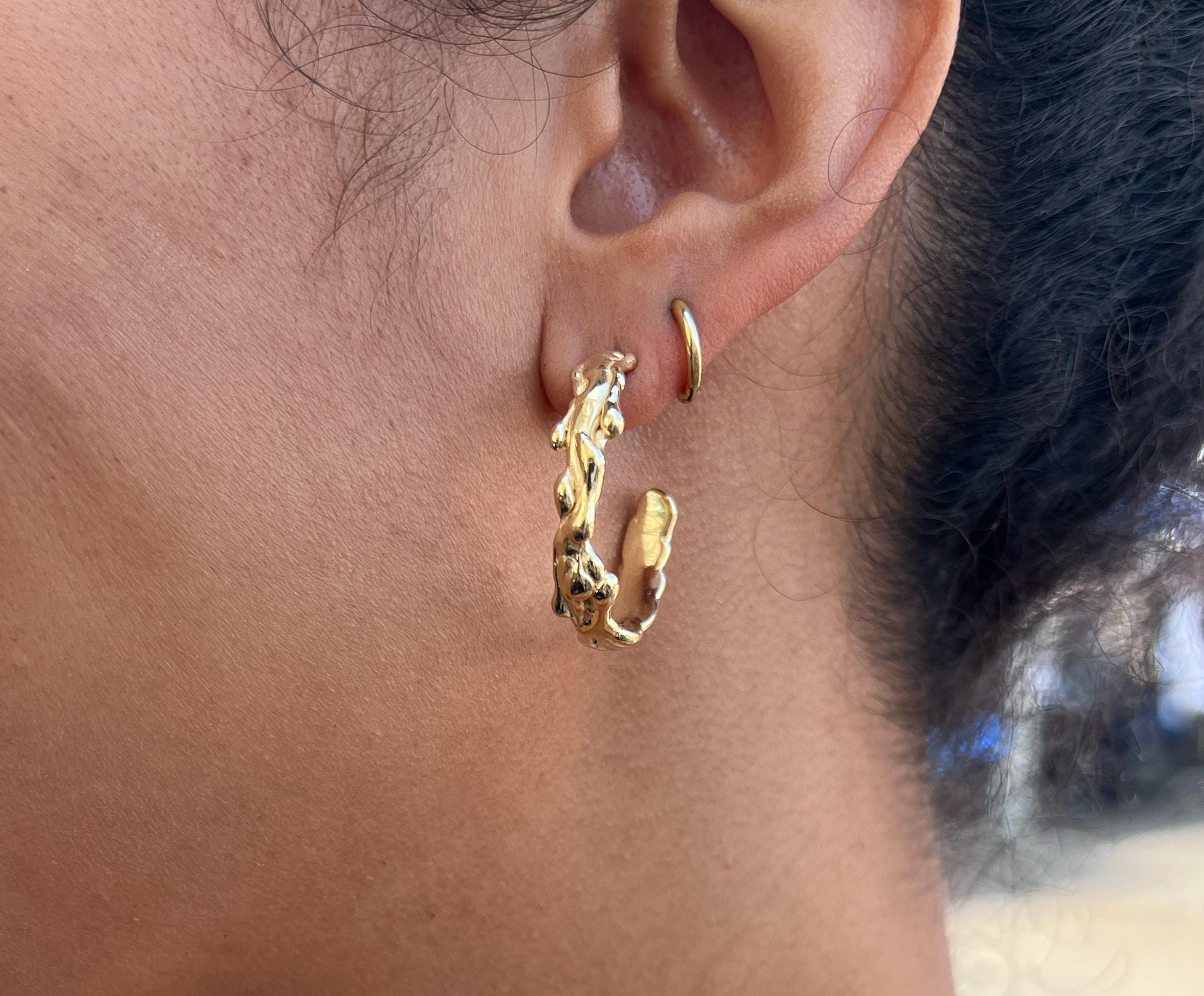 The Wide River Hoops studs uniquely capture the beauty of a tumbling river frozen in time in this thicker version of the original River Hoop Studs. Available in solid sterling silver or a heavily 14k gold plated brass with no nickel. All other components are sterling silver under the gold. 1" diameter.