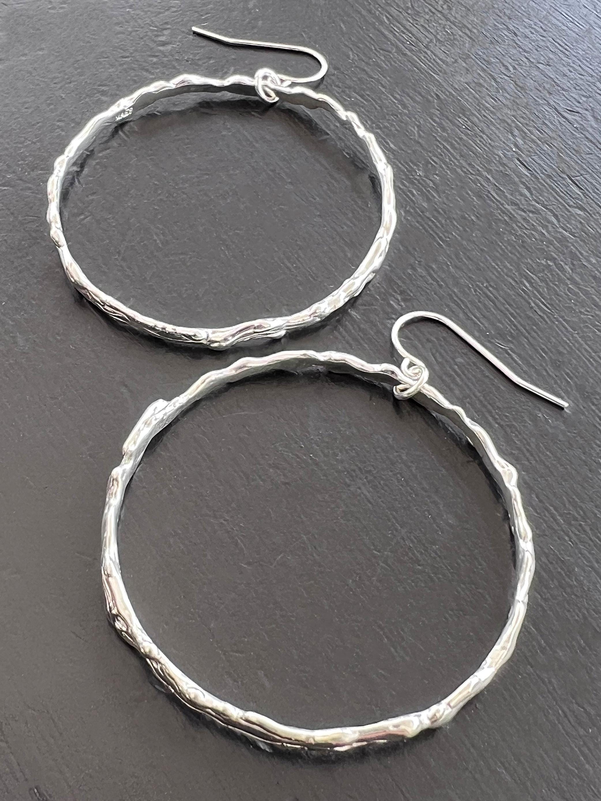 The River Hoops uniquely capture the beauty of a tumbling river frozen in time. Hand melted wax went into making each one of the pair in this unique collection. Available in solid sterling silver or a heavily 14k gold plated brass with no nickel. All other components are sterling silver under the gold. 2" diameter.
