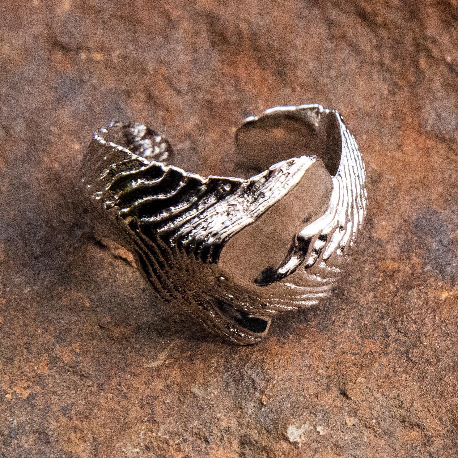 The cuttlebone cast Riptide Ring features a unique approach to ring design for me. Leaving the unconnected, split-bottom open allows for a more comfortable fit and adjustable sizing. The cuttlebone texture is truly breathtaking on this design!