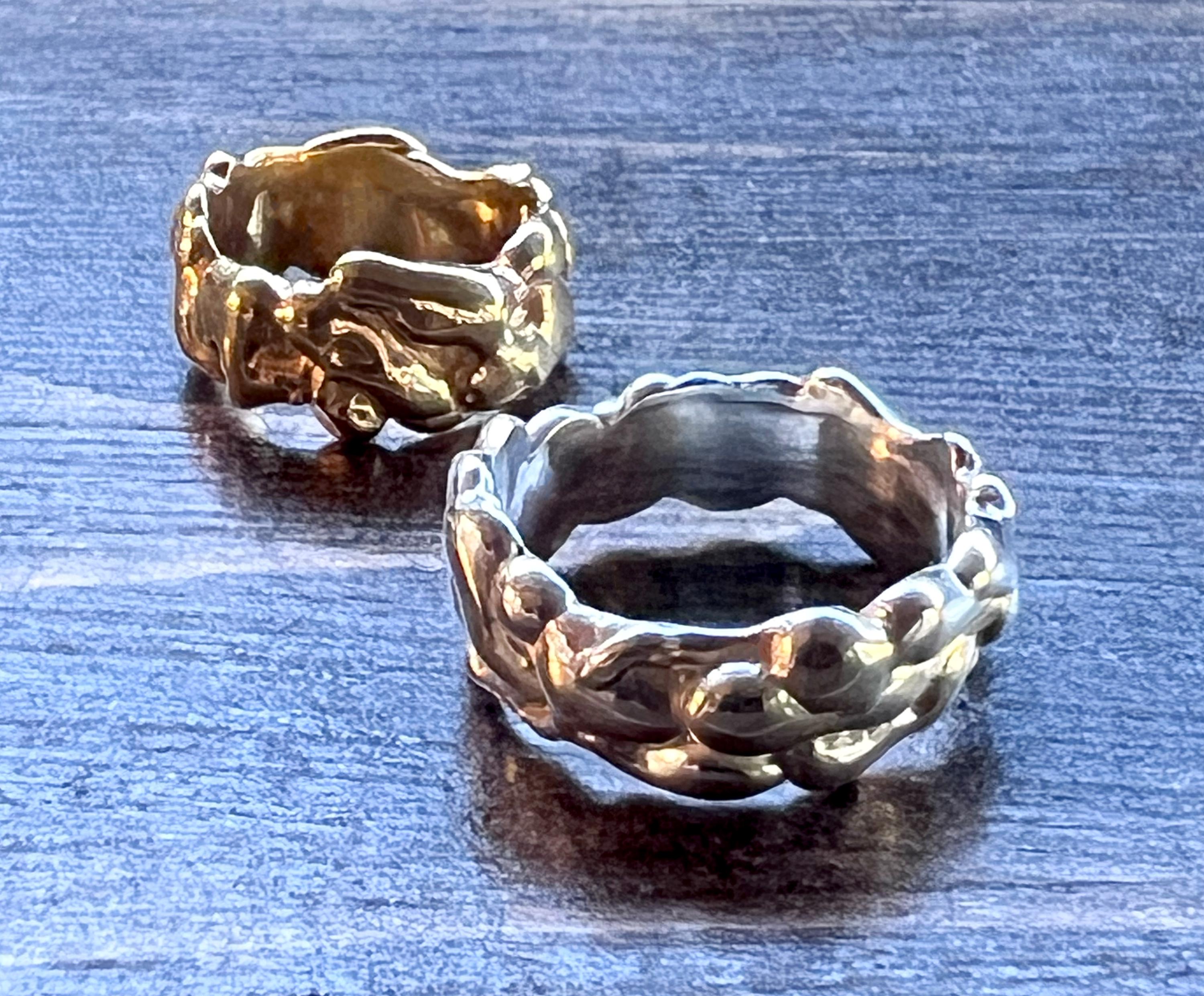 MAES Jewelry is cast in solid sterling silver with an upgrade option of 14k gold vermeil using no nickel. Inside each ring is a tiny brand logo and a 925 stamp indicating sterling silver. Each piece is handmade once you place your order, so please allow 2-4 weeks before shipping. Additionally, for many years it has been my great pleasure to make all of this work by hand and to sell it to you at affordable prices. However, costs of materials including gold and silver have risen to such high levels that I am forced to raise prices to stay in business. I hope you understand and that you continue to support my jewelry business for the quality of work and design. Thank you!