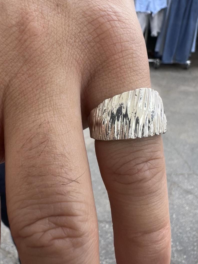 Cherrywood, in my series honoring California trees, is a hand carved wedge band featuring a uniquely one-of-a-kind, hand made texture that I enjoy creating. Approximately 1 cm wide at max.